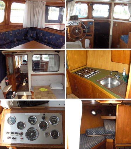 | Ca. 10,5m x 3,5m, Tiefgang: 1m, Baujahr: 1975, 84PS DAF 475 Diesel (6 Zyl.), 3 Schlafplätze, 2. Steuerstand, Mahagoniausbau, Material: Stahl, Code: H |